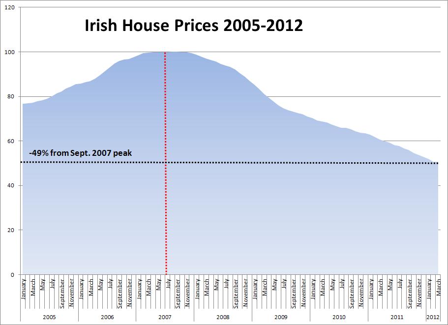 Overall, average house prices nationwide have fallen by49% since their peak according to the CSO, whose data is compiled on the basis of mortgage drawdowns. This likely understates the extent of the collapse in house prices, as it discounts cash transactions which have become increasingly important in recent years. Continue reading