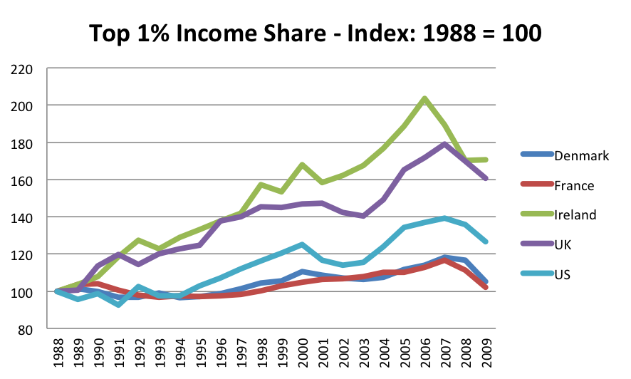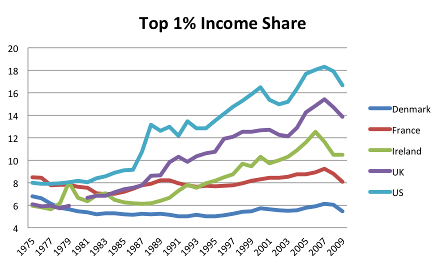 Piketty, Saez and others – including Ireland’s Brian Nolan – have since worked to bring together data on top income shares for some two dozen countries and counting in a consolidated database (complete with helpful interactive graphics).