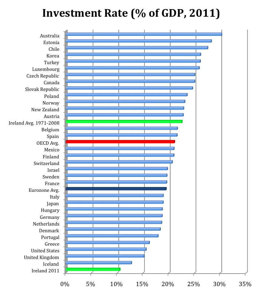 At 10%, the Irish investment rate (Gross Fixed Capital Formation / GDP) in 2011 was less than half the OECD average in 2011, half the Eurozone average, only four fifths that of Iceland, the next lowest OECD member at 12.7%, and less than Greece (16.2%), Portugal (17.9%), Italy (18.9%) and Spain (21.6%).